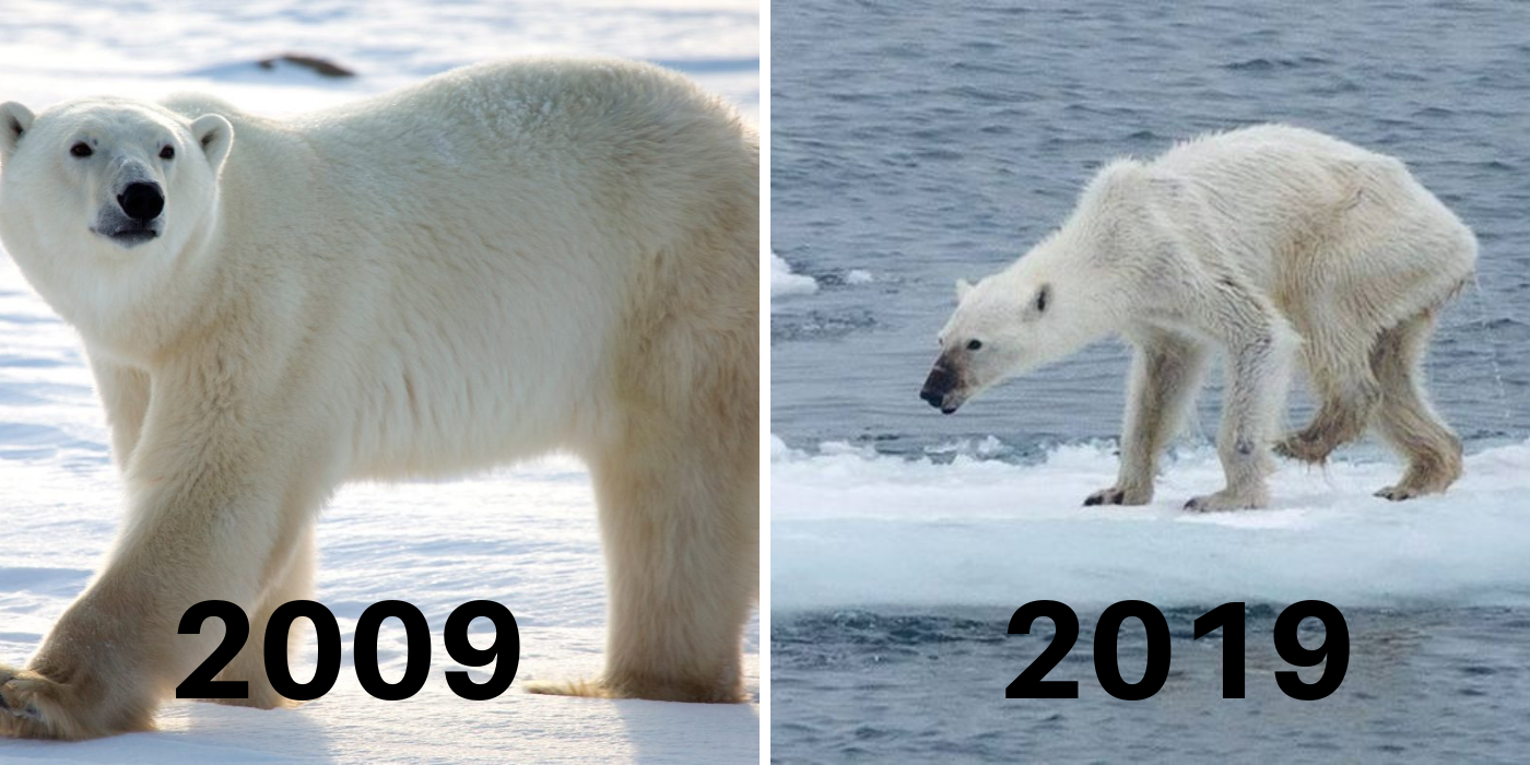 Este challenge trata de tomar una foto y luego subir cuanto a cambiado en 10 años y esto es alarmante, aquà se muestra la foto de un oso polar en el 2009 y 10 años mas en el 2019, esto se debe a la contaminación al calentamiento global que a derretido los polos y subiendo el nivel del mar dejando a los osos polares sin hogar ni alimento, no solo son a ellos miles de pingüinos bebes han muerto debido a el calentamiento.